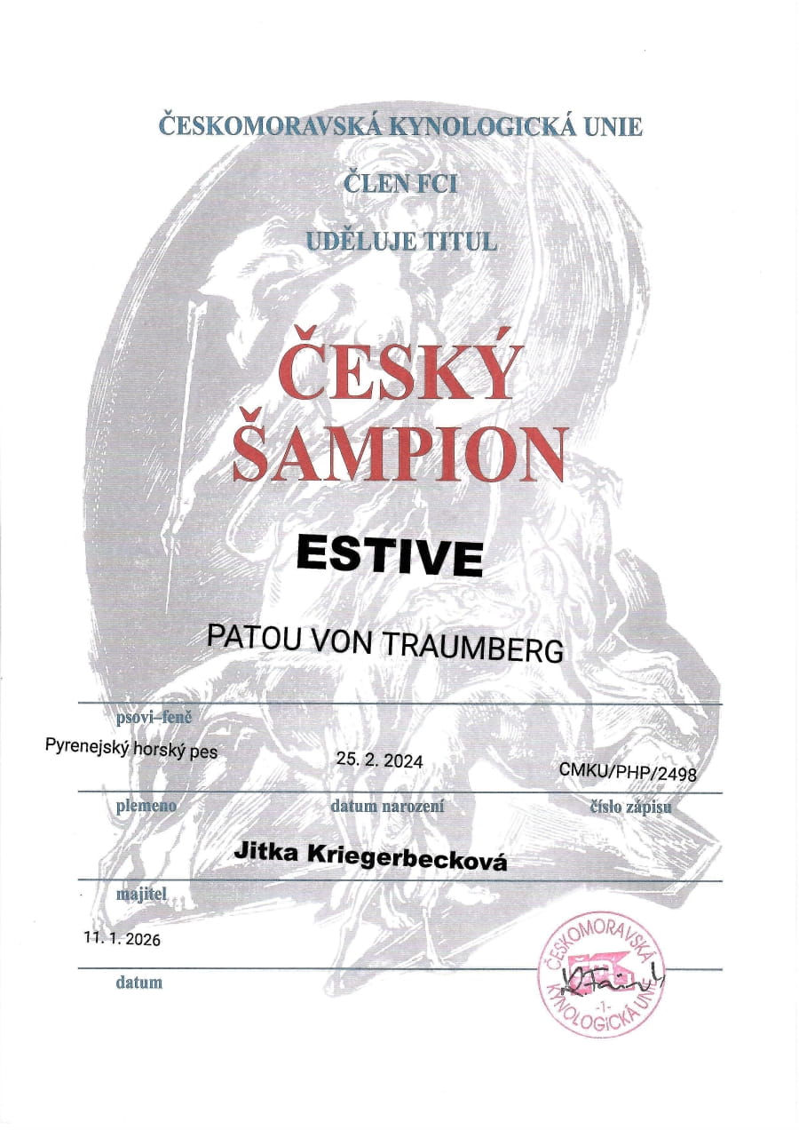 Estivka na NV v Brně (pos. Miroslav Václavík) získala v mezitřídě poslední CAC a splnila podmínky pro udělení titulu Český šampion.