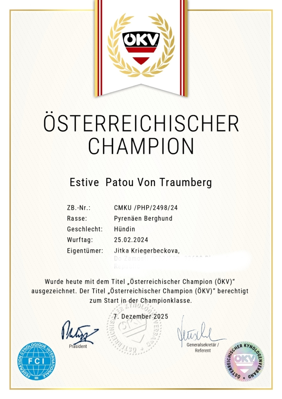 U izraelského rozhodčího pana Dorona Rachlina Estive uspěla, získala tituly V1, CAC, CACIB, BOB, Winner Wels. V mezitřídě to byl její 4. titul CACA, a tak splnila podmínky pro udělení titulu CH Rakouska.